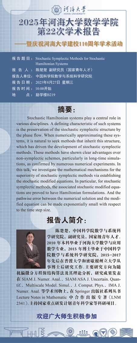 数学学院第22次学术报告: Stochastic Symplectic Methods for Stochastic Hamiltonian Systems