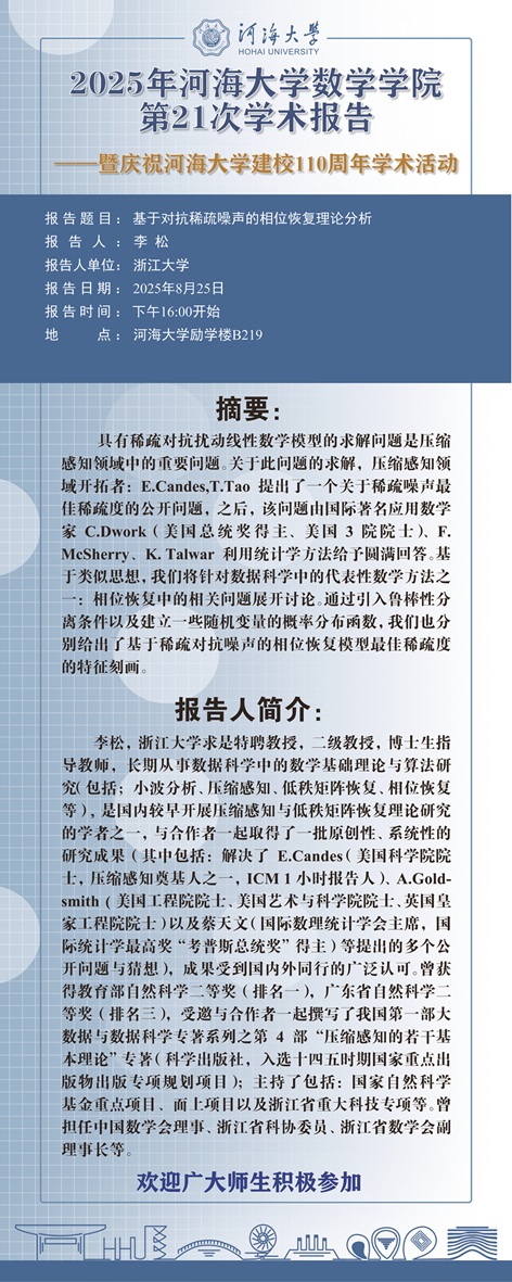 数学学院第21次学术报告:基于对抗稀疏噪声的相位恢复理论分析