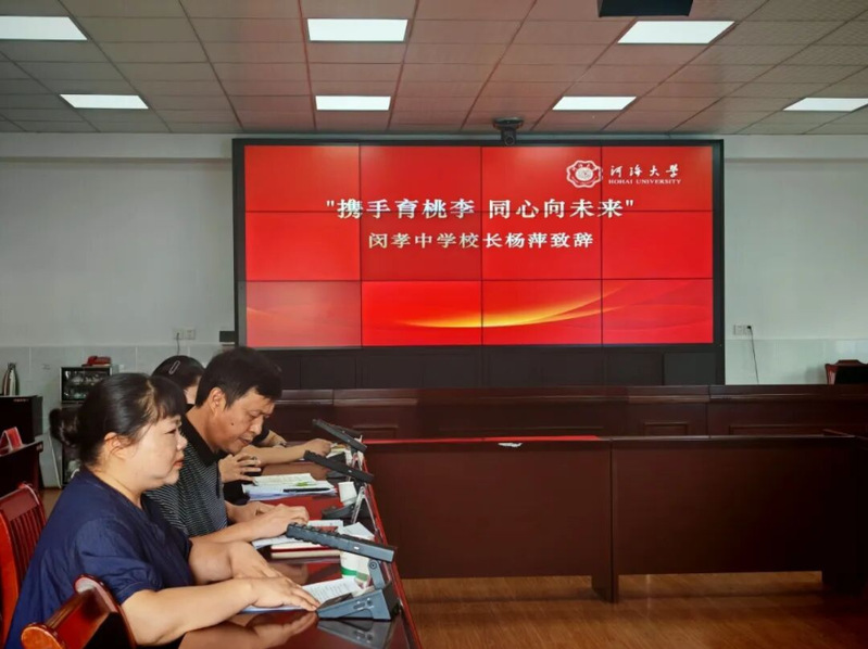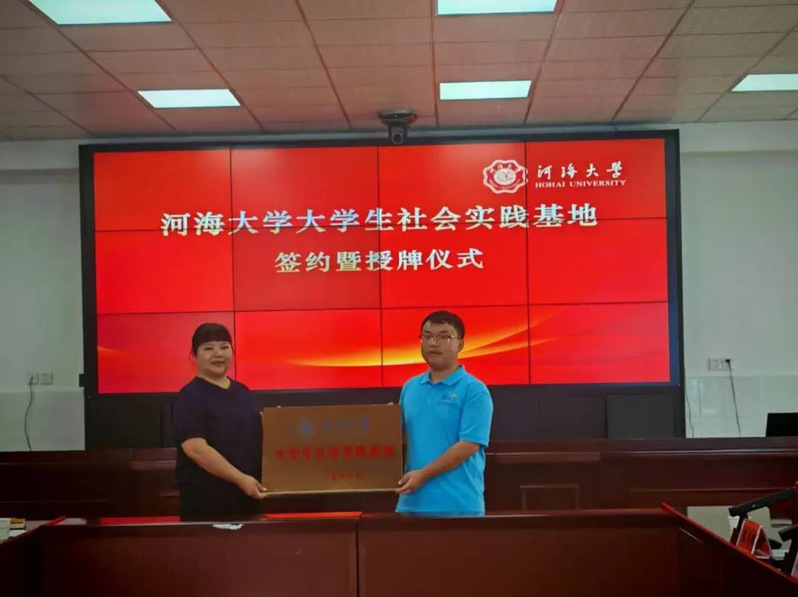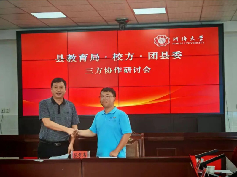 座谈会上举行了签约授牌仪式。县教育局党组成员雷江文与实践团队长阳春旗签署《建立河海大学大学生社会实践基地协议书》,杨萍校长接牌。闵孝中学正式成为河海大学社会实践基地,为长期教育帮扶奠定基础。