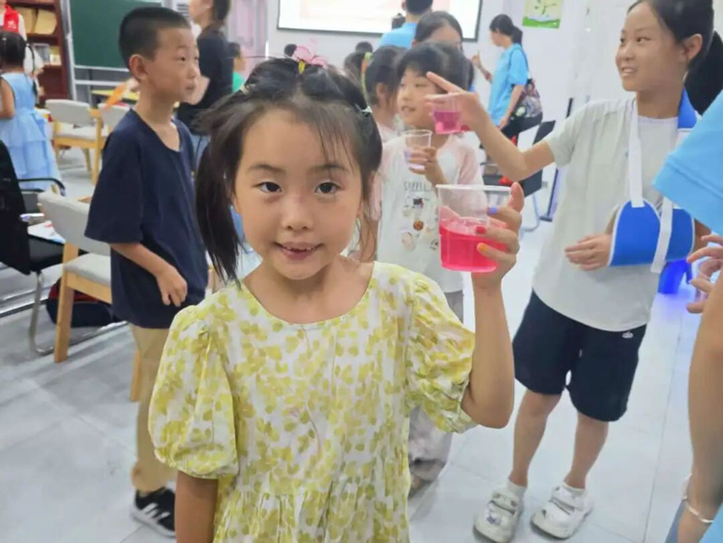在东湖路社区活动现场,志愿者们将紫甘蓝叶片浸泡出的紫色液体分别倒入不同的溶液中,原本统一的紫色瞬间变幻出红、绿、蓝等多种色彩。“这是因为紫甘蓝里的物质能‘检测’溶液的酸碱性哦!”志愿者一边演示,一边用通俗易懂的语言讲解酸碱原理,孩子们瞪大双眼,不时举手提问,好奇地想要亲手尝试。