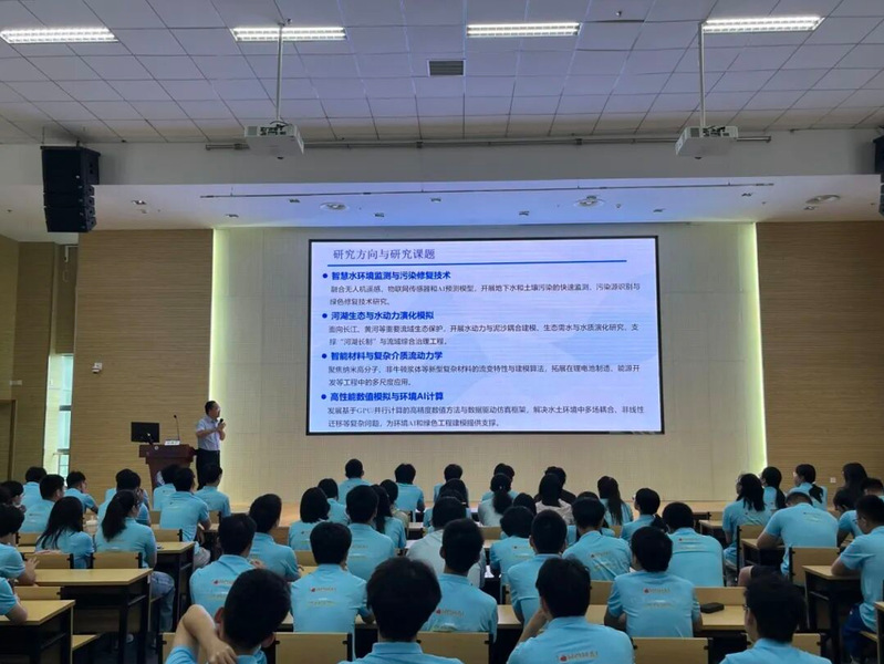 报告会上,孙洪广教授以自身经历为切入点,用真挚的情感与质朴的语言,为新生分享成长经验与专业见解,为在场同学带来了启发。他向新生提出“志存高远,脚踏实地”的期望。随后,他详细地介绍了自己的研究方向与工作经历,重点说明数学知识在水利水电等工科领域的实际应用场景,帮助新生理解数学学科的实用价值。